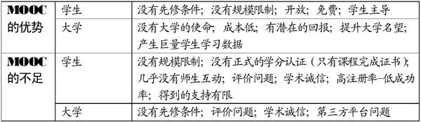 表一 香港大学的苏德毅教授根据研究结果制作了一个表格用于比较MOOC的优势和不足