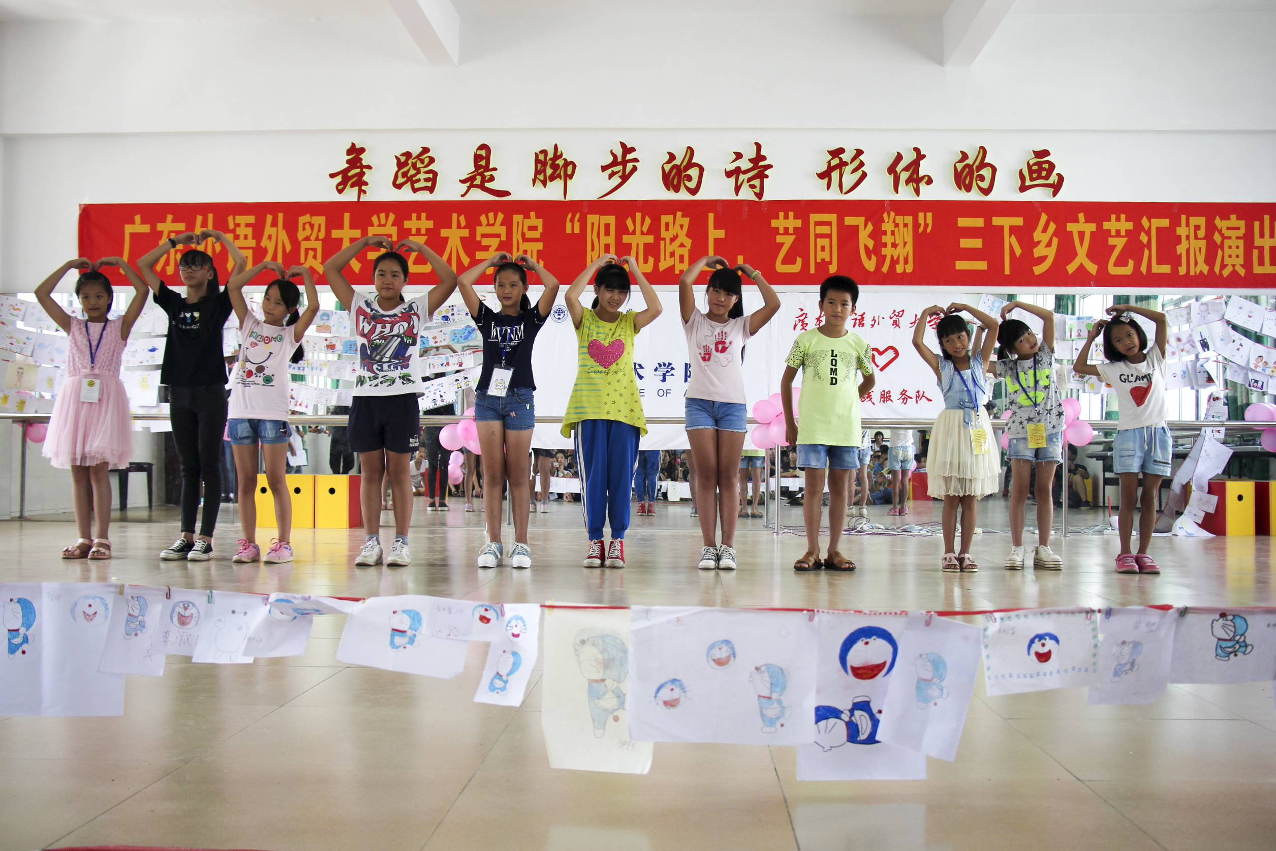 本网讯 8月1日上午,艺术学院“阳光路上,艺同飞翔”三下乡文艺汇报演出在英红镇中心小学隆重举行。英红镇中心小学副校长林先富、李传星,少先队辅导员张汝梅老师,艺术学院三下乡带队老师杜恩妤以及众多学生家长一起观看了“Sunshine”服务队三下乡活动的成果。