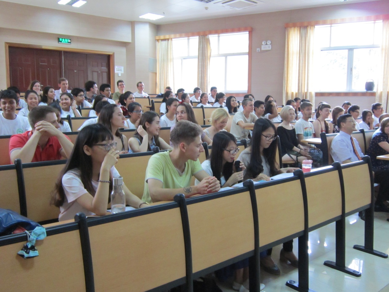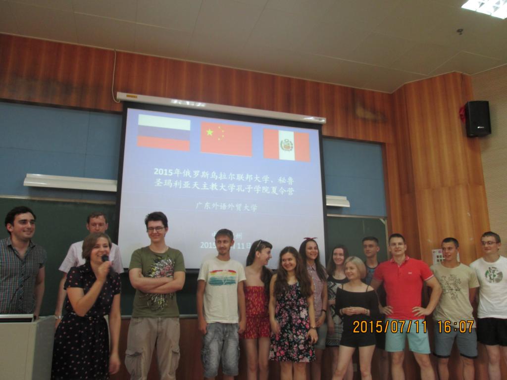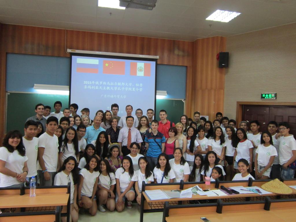 本网讯 7月11日,秘鲁圣玛利亚天主教大学孔子学院、俄罗斯乌拉尔联邦大学孔子学院2015暑期夏令营在我校开营。留学生教育学院院长梁学宏、秘鲁圣玛利亚天主教大学孔子学院中方院长彭启贵、俄罗斯乌拉尔联邦大学孔子学院带队老师亚历山德拉及62名俄罗斯、秘鲁学生出席了开营仪式。