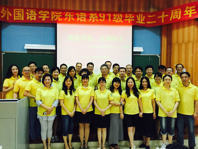 本网讯 7月4日下午,1991级原东语系校友在七教107报告厅欢聚一堂,庆祝毕业二十周年。院长陈多友、党委书记杨敏生等学院领导和杨诎人教授、魏育邻教授、韦立新教授、朱刚琴副教授等教师代表应邀出席校友活动。