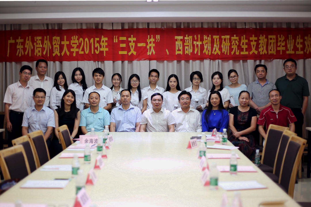 本网讯 6月24日,我校2015年度“三支一扶”、西部教育计划及研究生支教团毕业生欢送会在北校区统战会议室举行。我校副校长刘海春,学生工作部部长谢应东,研究生工作部部长康为茂,学生就业指导中心主任谢秀兰以及相关学院有关负责人出席会议。会议由校团委副书记余海波主持。