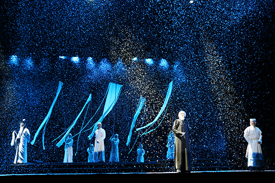 哀乐声起,雪花纷飞,康有为的灵柩被慢慢抬了出来,在舞台的蓝光映衬下格外凄清。康有为的去世令梁启超格外心痛,得知老师去世前仍惦记十年前的那句“世有康梁,再无康党”,愈加责备自己。梁启超的内心与康有为的灵魂之间的对话让我们真正进入他们的内心,感受着他们对互相的理解包容和那颗不变的爱国心。