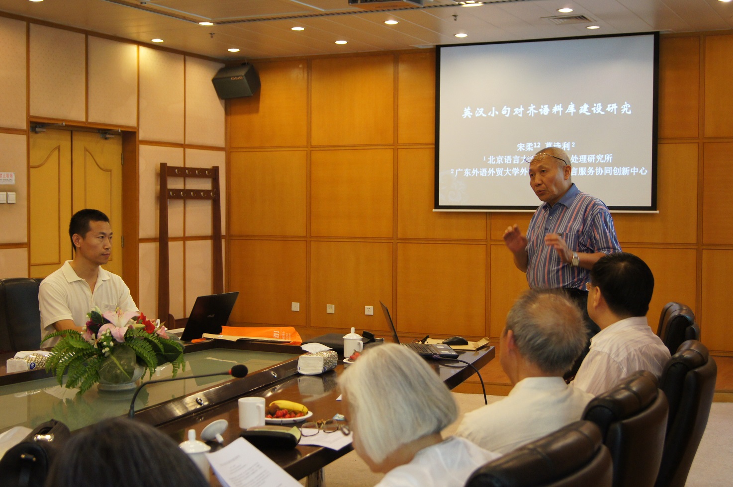 中心副主任葛诗利首先向专家介绍了中心的发展与特色,以及语言技术创新团队目前的工作任务,表达了中心对“英汉小句对齐语料库建设”项目的重视,恳请专家们提出宝贵意见。他对研究项目的进展以及所遇到的问题作了专题报告,指出汉语和英语的篇章都可以表示为指称语为中心的准小句序列,每一个准小句具有Naming-Telling结构。这一结构适合于表示篇章结构,能反映认知约束,具有高度的实证性,因此Naming-Telling结构具有篇章文法的意义。项目预期成果可直接用于英汉机器翻译的训练语料,完善机器翻译的评价系统,促进跨语言的篇章语法研究、英语和汉语的小句异同研究、语言认知机制和认知语法研究。