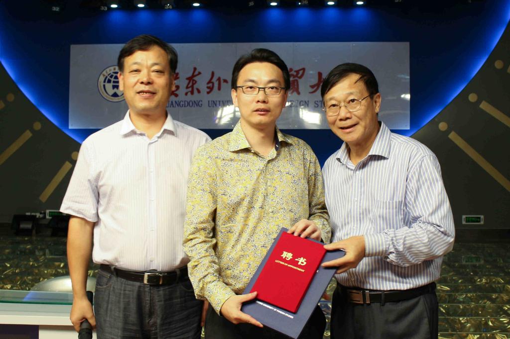 | 陈建平(右)与杨魁(左)为周兆呈(中)颁发聘书 |