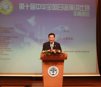 出席本次大会的有大会委员组织代表、中国教育国际交流协会主任余有根,日本华人教授会议代表、日本侨报社编辑长段跃中,日经中国(香港)有限公司代表社长清水贞治,协力企业、日本航空广州分店长矢都木洋一,日本驻广州广州总领事馆领事相原良江。我校副校长方凡泉、国际合作与交流处副处长吴俊峰、东方语言文化学院院长教授陈多友、东方语言文化学院副院长教授张秀强以及暨南大学外国语学院副院长王琢、厦门大学外文学院副院长陈端端、福建师范大学外国语学院副院长林璋、广西师范大学外国语学院日语系系主任李明华、海南师范大学外国语学院日语系系主任曹春玲等评委嘉宾也出席了本次大赛。