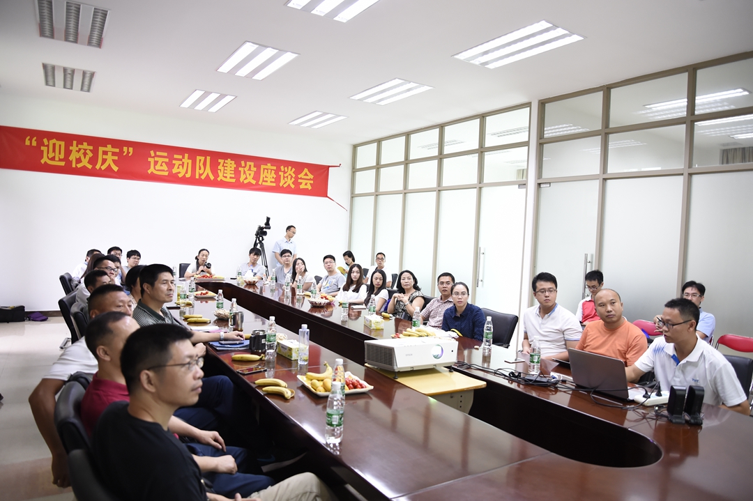 本网讯 5月9日下午,广外50周年“迎校庆”运动队建设座谈会在广外北校区体育部会议室举行。来自各行各业的27位校友代表,欢聚一堂,追忆当年的似水年华,共话运动会拼搏的日子,共图母校体育发展大计。出席此次座谈会有体育部主任林少娜、党总支部书记李旭武以及校运动队教练员等。