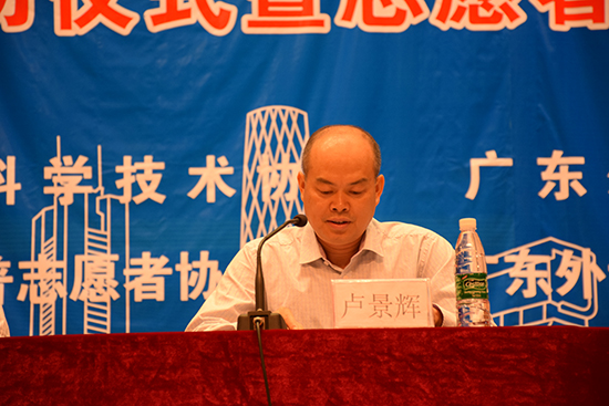 在奏唱国歌之后,卢景辉讲话。他首先向到场的志愿者们表示欢迎。卢景辉说,我校一向重视志愿服务工作,此前组织近万名志愿者参加了多次大型赛会服务工作,如上海世博会、广州亚运会、深圳大运会等,都取得了优异的成绩,服务工作受到各界的好评。谈到这次即将在广州举行的中国科协年会,卢景辉勉励在场的志愿者们要“全力做好准备,积极投身实践,以专业的水平和热情的服务,履行好志愿者光荣的使命。”同时卢景辉还寄语志愿者们,希望同学们在志愿服务的过程中勇挑重担,锤炼品行,开阔视野,展现大学生的良好风采。