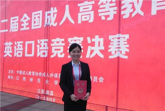 本网讯 4月26日,中国成人教育协会成人外语高等教育专业委员会第二届全国成人高等教育英语口语竞赛决赛在江西师范大学瑶湖校区隆重举行。我校继续教育(公开)学院黄玉珊同学以总分第一的成绩获得本科组一等奖,宋玉霞同学获得专科组二等奖。