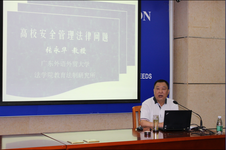 张永华分别从高校的校园性质、高校安全工作的法律依据、校园安全违法违纪行为处理规则、校园交通安全管理、校园消防安全管理、校园治安管理、高校安全事故处理七个方面进行了详细讲解。他指出高校是高等教育法人管理的场地,高校保卫机构是学校安全管理部门,承担校园安全管理职责,高校保卫人员可以采取管理措施保障校园安全。这也是有明确法律依据的,在《中华人民共和国教育法》、《中华人民共和国治安管理处罚法》、《中华人民共和国刑法》、《中华人民共和国侵权责任法》、《中华人民共和国交通安全法》、《中华人民共和国消防法》、《中华人民共和国突发事件应对法》中都明确有关于高校校园安全条款。张永华结合大学章程和校园实际案例,解读如何依法依规做好校园安全管理,他强调高校保卫人员要有安全意识、法治意识、服务意识和大局意识,对校园安全违法违纪行为的处理必须依法依规。