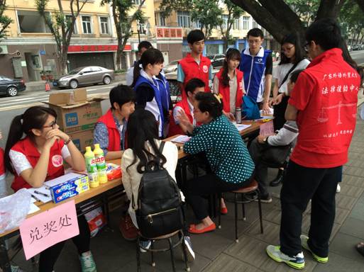 普法活动一开始,就有过往行人饶有兴趣地围上来玩法律知识游戏,让参与游戏的人在玩乐的同时收获法律知识。趣味十足的游戏还吸引了外国友人参与,法援志愿者们充分发挥“广外优势”,用流利的英文为其讲解游戏规则、题目及新消法亮点。不少老人小孩都积极参与法援的活动,法援志愿者们耐心讲解并带领他们玩游戏,寓教于乐,敬业的精神和谦和的态度让民众点头称赞。