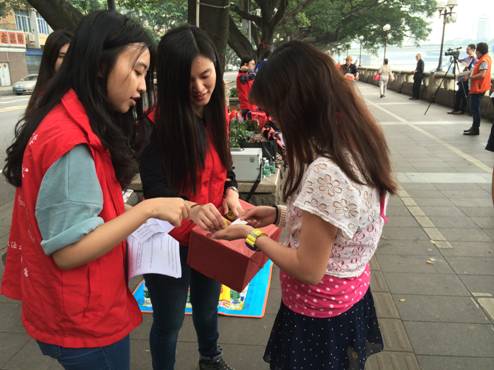 本网讯 广东外语外贸大学法律援助中心(以下简称“法援”)与华仁社会工作中心联合举办的三月维权普法活动于3月21日下午在海珠区鳌洲码头举行。法援中心的志愿者围绕“新消法,新权益”的主题热情地为过路民众提供普法服务。
