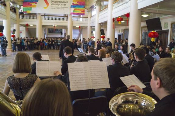 2月17日是俄罗斯乌拉尔联邦大学春季学期开学的第二天。学校主礼堂大厅张灯结彩,装饰一新。由孔子学院主办的充满异国风情的中国新年联欢活动,吸引了很多普通学生和汉语爱好者的目光。