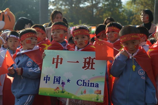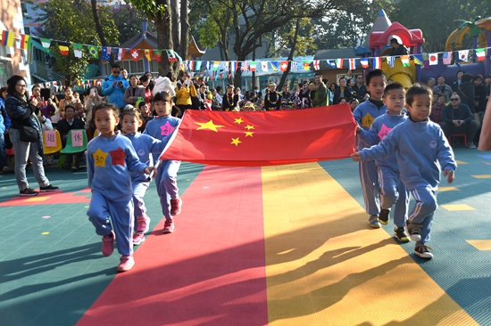 首先上场的是代表英国的小一班小朋友,身披英国国旗的他们就像一颗颗最闪亮的小星星,让大家在这个寒冷的冬天倍感温暖。代表着新西兰的小四班运动员们让人眼前一亮,他们身着统一的天蓝色衬衫上场,衬衫上赫然印着“8”这个数字。最后压轴上场的是代表中国的中一班小朋友们,他们额头上扎着有“中国必胜”字样的鲜红绸条,身披五星红旗,一身戎装自信满满地进入我们的眼帘。一曲《龙的传人》响彻上空,全场气氛进入了高潮,在场的老师、家长以及孩子们都不由自主地随着音乐拍起掌来。