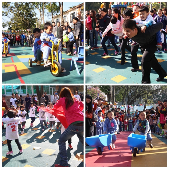 运动会上的项目各式各样,除了去年的单人项目及亲子项目外,今年还增加了一个新项目——各国家特色民间游戏。单人项目以年级为单位,有“走平衡木”“钻山洞”“运萝卜”等等。亲子项目由家长协同小朋友一同完成。在各国特色民间游戏中,小班的小运动员们挑战起西班牙斗牛游戏,中班的小运动员们则纷纷加入中国的跳皮筋游戏中,大班的小运动健将们参加的是韩国特色的拔河游戏,一个个磨拳檫掌,跃跃越试。孩子们在运动会上各展风采,团结一致,在老师和家长们的鼓励下,寓快乐于比赛中。