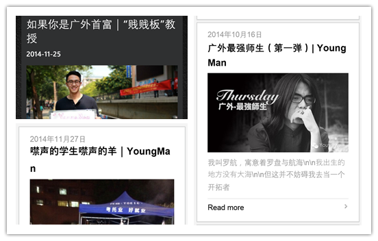 从9月17日发首条推送至今,已成功转型一次的YoungMan如今正经历第二次转型。另一位成员宋雪菲告诉记者,成立之初的稿子大部分围绕新生军训展开,但关注量不大。后来在转载文章的过程中,他们渐渐发现同学们喜欢好玩的东西。于是在学习借鉴后找到了突破口——广外的人物。从学校有故事的人展开,贴近生活,充满趣味。目前,在人物的采写上尝到甜头后,他们开始尝试拓宽内容范围。