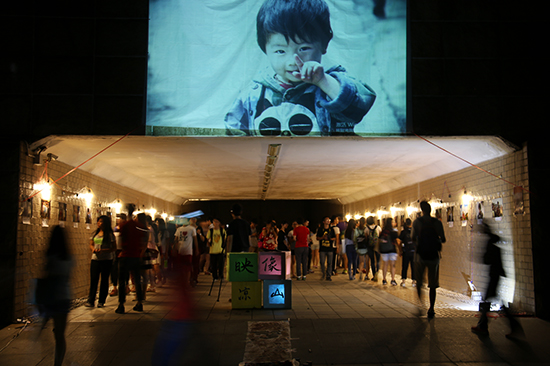 还没走进隧道,就能听到悠扬的民谣,看到四个泡沫方块上优雅地写着“映上凉山”,这是今年影像展的主题。据了解,encore原创音乐乐队是作为嘉宾被邀请过来的。