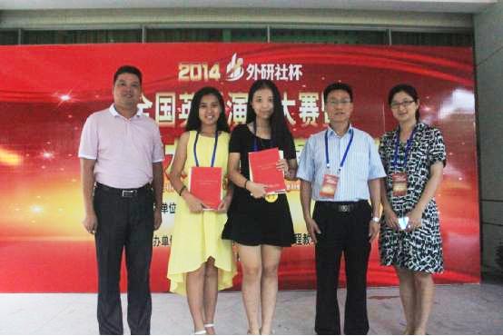 (左一:英语教育学院陈金诗副院长、右二:英语教育学院董金伟院长、右一指导老师国际商务英语学院陆璐老师)