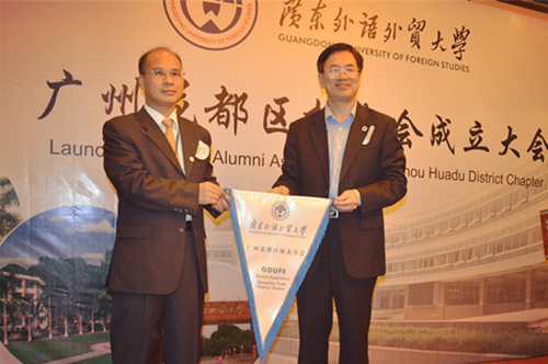 何传添宣布花都区校友会正式成立,向首任会长、我校88级商务英语专业学生黄平授予会旗及牌匾并代表学校致辞。他对花都区校友会的成立表示祝贺,并向校友们介绍了当前我校的总体概况、发展情况及发展目标等。同时,他诚挚邀请校友常回“家”看看,相约共庆我校50周年华诞。