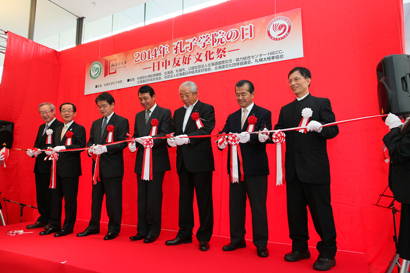 本网讯 日本当地时间9月28日上午10点日本札幌大学孔子学院在札幌市中心札幌55大厦一楼大厅和五楼隆重举行“孔子学院成立10周年” 庆典活动。北海道副知事高井修先生、札幌市副市长生岛典明先生、北海道日中友好协会会长青木先生、中国驻札幌总领事藤安军先生出席典礼并剪彩。参加庆典的还有北海道日中经济友好协会和其他友好团体以及中国东航、中国国航等中资企业以及一般市民600多人。