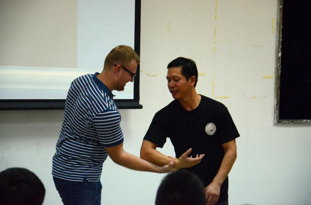 第二位主讲嘉宾是龙保咏春拳武馆馆长陈巨如师傅。伴随着气势如洪的背景音乐,陈巨如师傅给大家示范了刚柔并济的咏春拳法,并向在场观众讲述了龙保咏春拳武馆的慈善工作。陈师傅还邀请学生上台进行切磋,示范如何在歹徒面前进行正当防卫,使现场气氛再现高潮。
