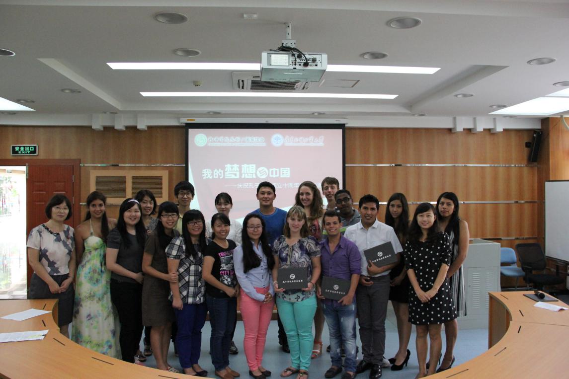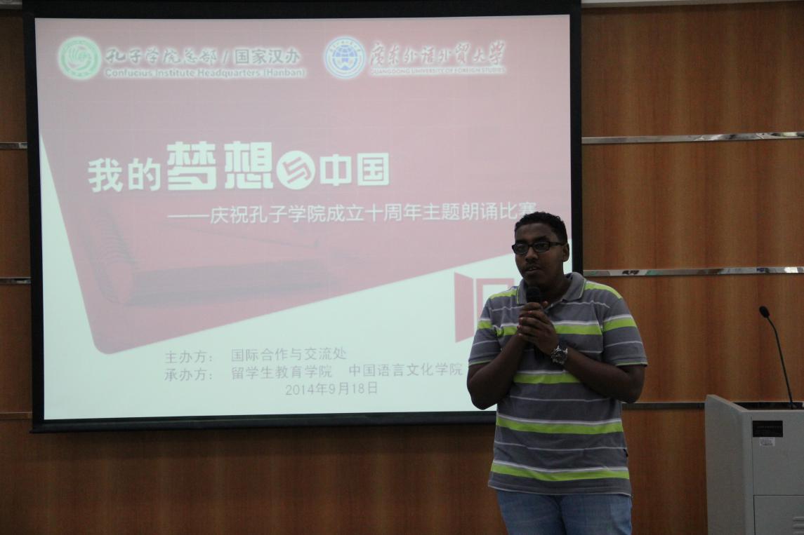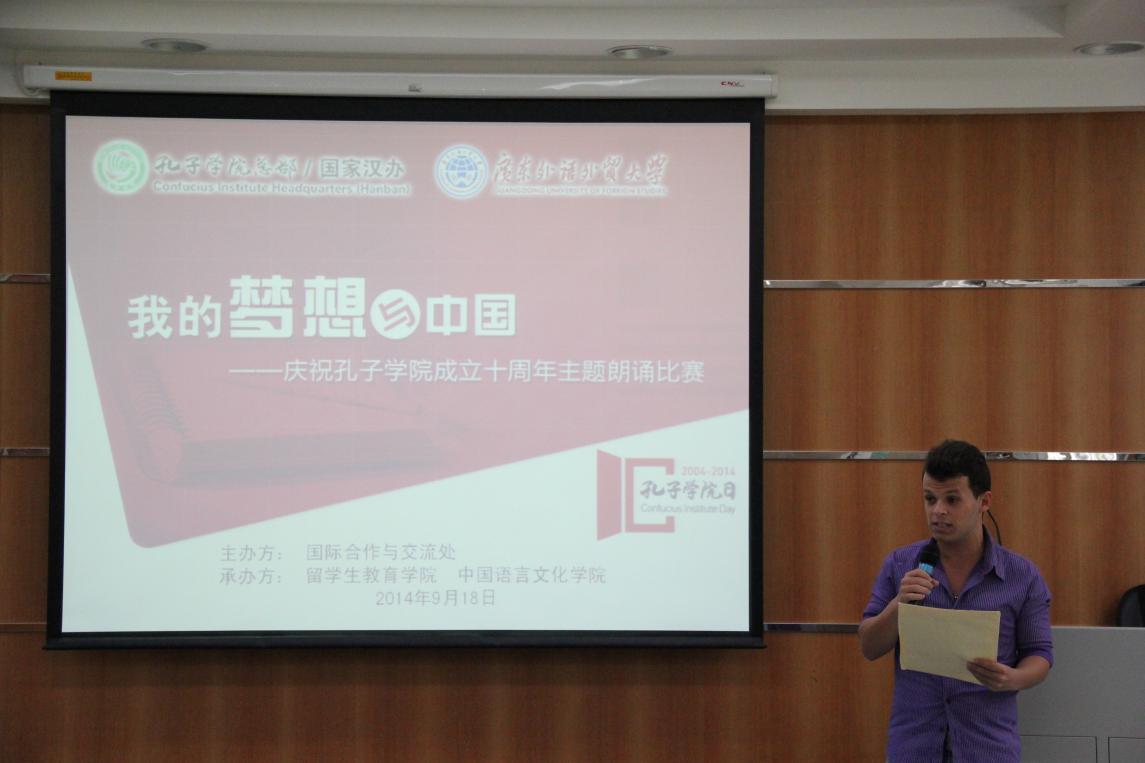 本网讯 9月18日下午,为庆祝孔子学院十周年,由我校国际合作与交流处主办,留学生教育学院、中国语言文化学院承办的“我的梦想与中国”中文朗诵会在我校第九教学楼103室举行。共有来自俄罗斯、秘鲁、美国等11个国家和地区的孔子学院奖学金生参加了此次活动。