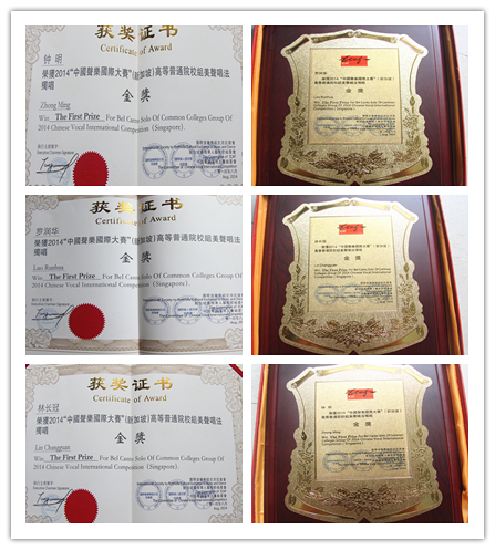 本网讯 暑假期间,2014新加坡国际华人艺术节(ICAF)在新加坡举行,期间同时举行“2014中国声乐国际大赛”。我校艺术学院杨健生副教授应邀担任评委。我校艺术学院学生在本次“中国声乐国际大赛”比赛中,凭借良好的心理素质和专业水准以精彩的表现获取佳绩。钟明、林长冠、罗润华获高等普通院校组美声唱法组金奖,郭禹、蔡羡莹获高等院校美声组银奖,黄颖莉获高等院校民族唱法组银奖。