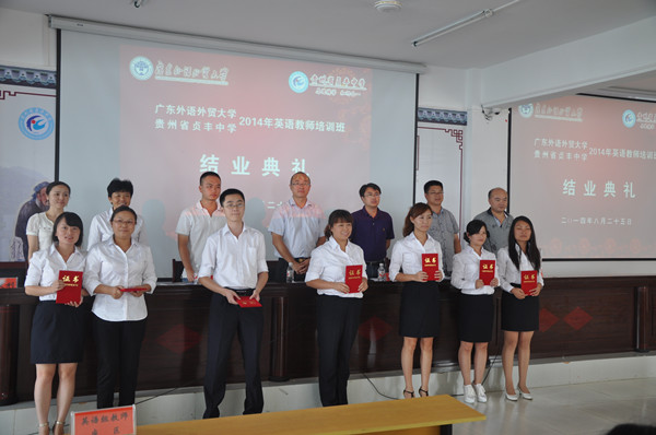 本网讯 为落实我校与黔西南州战略合作框架协议,近日我校在贵州省贞丰中学开展了英语教师培训班,并选派四名英语教育专业大四学生开展英语支教活动,为期两个月。8月25日,贞丰中学英语教师培训班结业典礼在贞丰中学图书馆多功能教室举行。黔西南州州长助理张建武,共青团黔西南州委书记黄清勇,贞丰团县委、教育局等相关负责同志出席典礼。会议由我校团委实践部部长余海波主持。