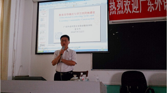 董金伟针对当地中小学校级领导和英语教师分别作了“教育领导类型与学习共同体建设”、“现代外语教学理念与教师发展”的主题讲座。他从教育领导风格模式入手,向校级管理层学员们分别论述了“新世纪社会的特点”,“新世纪技能学习运动”,“新世纪的教育领导素养和如何建设学习共同体”等三个问题。针对中小学英语教师普遍存在着的教育观念相对滞后,教师自身发展有待提高的问题,他从“英语的学与教:为什么?”引入英语学习动机与内容,对现代外语教学理念,英语教学方法与策略,教师发展与行动研究和外语教学提出了改革建议。