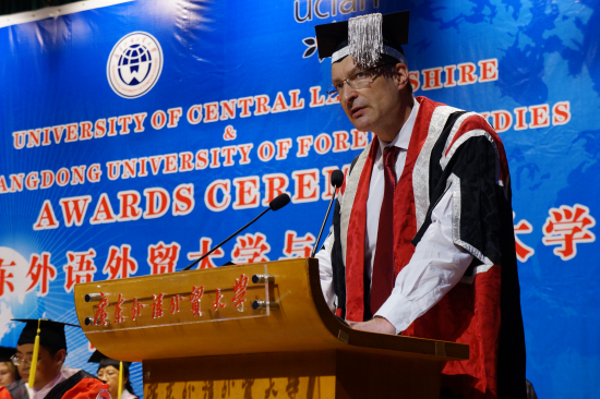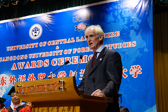 双方校歌、国歌奏唱完毕,达尔玛·科夫理致辞。他祝贺国际班三个专业(国际商务、国际商务文化、国际新闻)的学子顺利完成在广外的学业,并欢迎他们在未来一年里“享受”UCLan的异国校园生活。他还特别感谢学生家长以及国际班的教职工:“今天对于你们来说也是一个特别的日子。你们一路以来给了学生很大的帮助。”