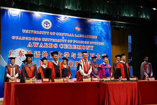 本网讯 6月23日下午,我校与英国中央兰开夏大学(以下简称UCLan)国际班结业典礼在北校区六教报告厅隆重举行。在金色权杖引领之下,UCLan副校长格拉汉姆·伯德温(Graham Baldwin)、商务学院院长达尔玛·科夫理(Dharma Kovvuri),我校副校长方凡泉、国际学院党总支书记何洪亮、副院长刘明等教师代表,在国际班2014届结业学子及他们亲友们雷鸣般的掌声中缓缓步进会场,拉开了典礼的序幕。典礼结束后,国际班140多名学子将于9月前往英国继续学业。
