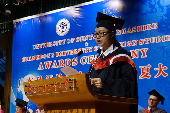 随后,在《凤鸣岭南》的激昂旋律中,学子们一一上台从两校副校长手中分别接过结业证书。学生代表余伊琳忘不了在广外学习的两年时光:“我记得那些在24小时自习室写论文到凌晨3点的睡眼朦胧,我记得第一次在成绩单上看到自己不合格的失望伤心。”她十分感谢两年以来陪伴她走过的好友与老师,并表示十分期待前往英国学习,揭开人生的新篇章。