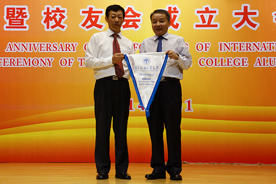 庆典后,国际学院举行了校友会成立大会。大会通报了校友会筹备情况,审议通过了校友会章程和校友会领导机构候选人名单。我校校友总会常务副会长、副校长许国彬向国际学院校友会授旗,宣告历经一年筹备的国际学院校友会正式成立。