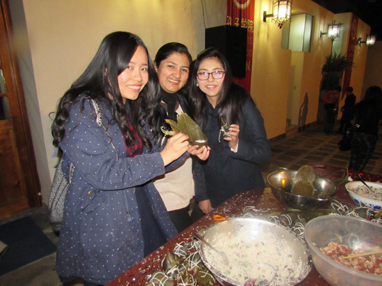体验中国传统文化 晚会开始前,中国老师先教学生如何包粽子,并介绍粽子的所需材料和这一美食所承载的博大中国文化内涵。学生们都跃跃欲试,纷纷围拢在桌子边认真学习要领,饶有兴致地包起来。大家如同家人一般一边包粽子,一边聊关于端午节的故事,其乐融融。香喷喷、热腾腾的清香粽子出锅了,在场的秘鲁朋友兴致盎然地品尝着糯香筋道的粽子,赞叹中华美食的丰富多彩,直夸“好吃,muy rico.”