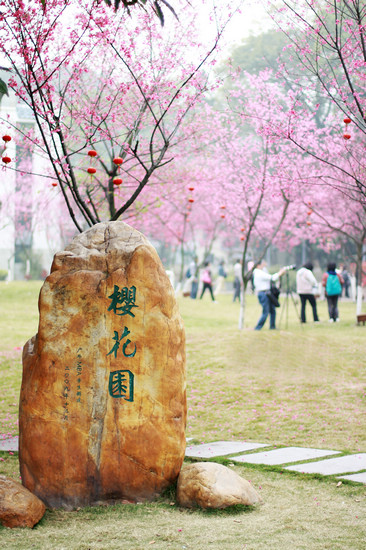 樱花园位于广外南门与相思河之间,这里过去曾是游泳池所在地,校园改造后,填平了泳池,在此基础上建起了这个花园。虽然樱花园面积不大,但每当樱花烂漫时,一朵一簇,且颦且笑,且摇且曳,都恍若晚冬跌入人间的花之精灵,醉美了校园。