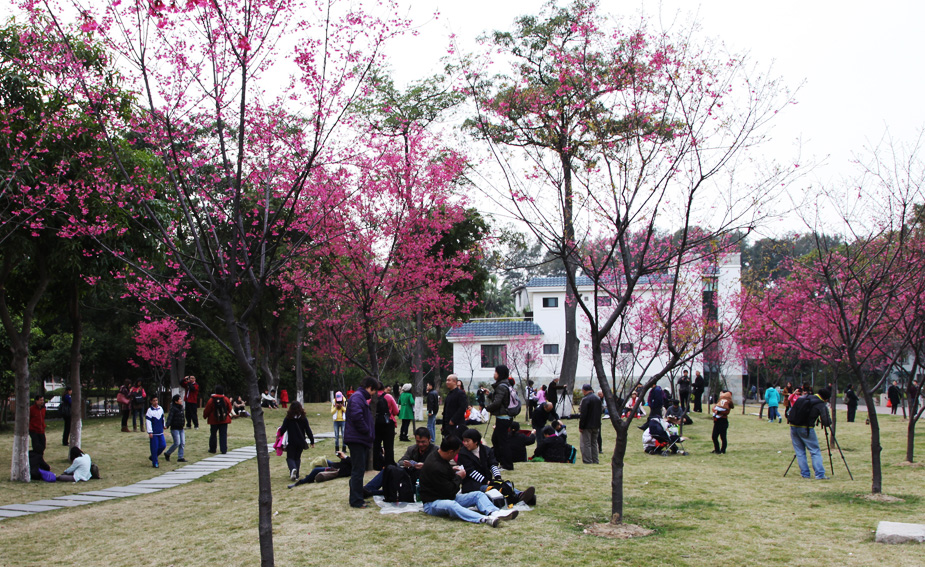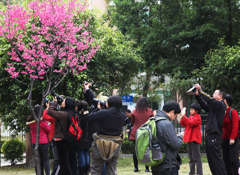 因为樱花园樱花满枝头的季节,恰是广外学子回家团聚齐贺春节之时。虽然广外学子少有一饱眼福的机会,但广州市民却多了一个赏樱的去处。每当樱花盛开之时,留校的师生三两成群漫步园中,好摄之友“长枪短炮”架满树下,微博、微信、互联网,铺天盖地的精美瞬间让广外学子大饱眼福,广外的美也通过这些瞬间走进千家万户,点缀着假日生活。