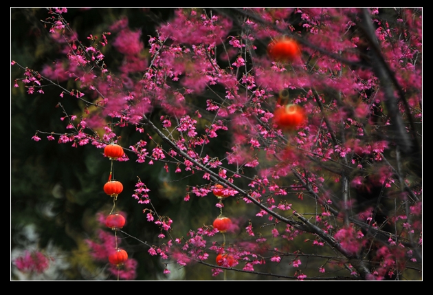 水红樱花、大红灯笼点缀着广外早春的校园