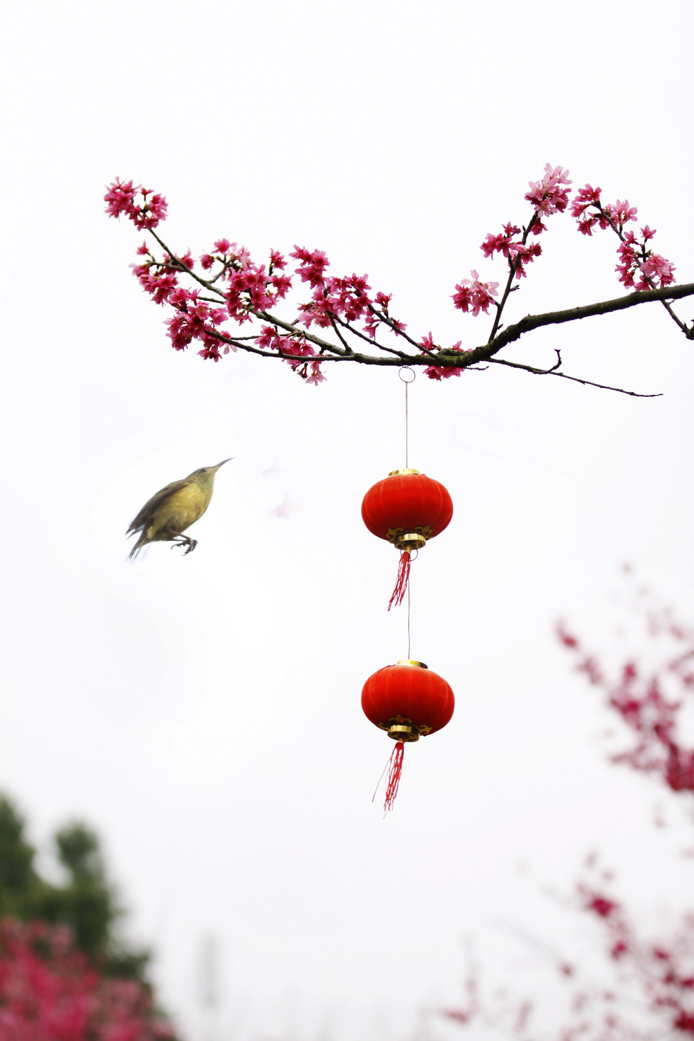 樱花、小鸟、灯笼构成一幅美丽的图画