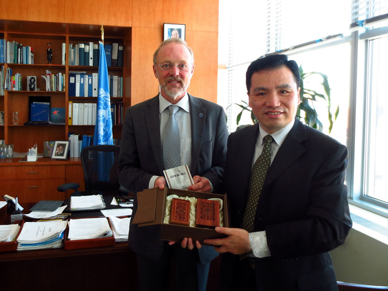 平洪向鲍曼助理秘书长赠送我校纪念品