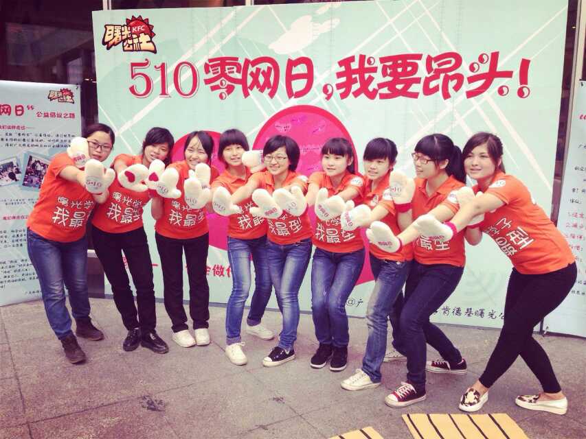 5月10日下午,在广州天汇城肯德基前,这样一场揭示网络依赖症危害的行为艺术吸引了众多市民驻足围观。这些年轻人是来自我校曙光公社的学生,他们以夸张幽默的行为向社会发出公益倡议:“零网日,我要昂头!”。