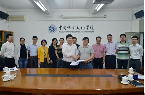 本网讯 5月4日下午,中文学院与粤港澳大学生创新创业协会关于原创大型话剧《宗岱的世界》(原话剧《梁宗岱》)资助协议签约仪式在三教422会议室举行。出席本次仪式的有粤港澳大学生创新创业协会执行会长梁睿、常务副秘书长杨彤,副秘书长罗炜、韩国秀,广东外语外贸大学副校长许国彬、中文学院院长刘小平、党委书记李和民、副院长刘海玲、党委副书记李江等。