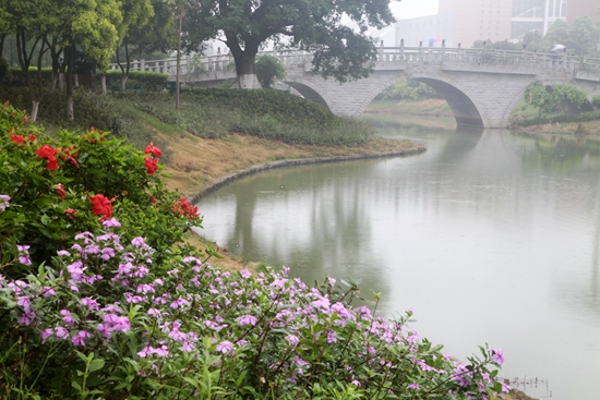 湖上还有三座样式古典的石质拱桥横跨,这三座桥不仅是连接教学楼与实验楼的交通要道,更默默地见证着广外南校的发展历史。一年又一年,她们迎来多少身穿绿装的新生在这里挥洒热汗,一年又一年,她们又送走多少学以成才的学子。