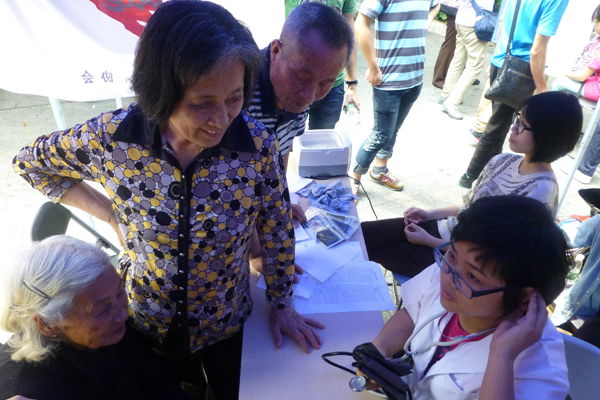 经贸志协及广中医红会的摊位主要为居民提供血压测量、视力保护、清洗眼睛等服务,志愿者们一边提供免费服务,一边发放宣传资料,耐心讲解相关知识,解答健康问题,深受中老年人的赞许和欢迎。