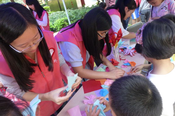 财院团学wing志协在本次活动中主要针对小朋友提供了剪纸和折纸教学,其中最受欢迎的是百合花造型的折纸,志愿者们用耐心和巧手给大家带来纸上艺术盛宴。