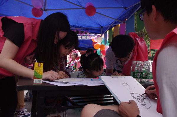 来自艺术学院艺心志愿者服务队的队员们发挥专业特长,用铅笔速写、卡通画像等方式,当场为各参与者亲手绘画出一张张惟妙惟肖的肖像。此外还设有儿童画画教学,创意绘画等服务,趣味无穷,深受小朋友和家长的喜爱。“艺心”无愧为现场最受欢迎的志愿服务队。