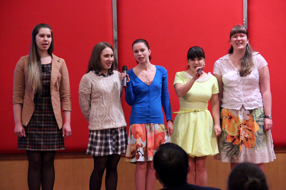 俄罗斯大学生代表阿立古讲话,表示毕业后立志当一名外交官,并希望有机会来中国工作。五位女生现场演唱了歌曲《喀秋莎》。