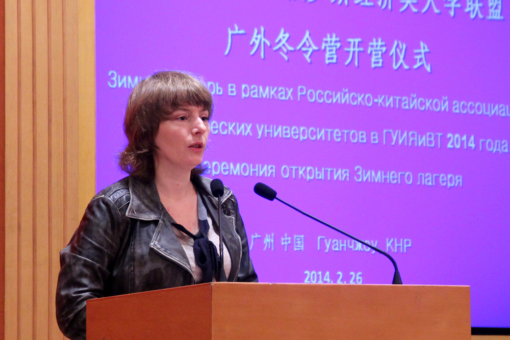 圣彼得堡国立经济大学阿列娜老师作为俄方教师代表发言,她用幽默风趣的语言表达了初次来广州的感受,并对广外热情周到的组织工作表示感谢。