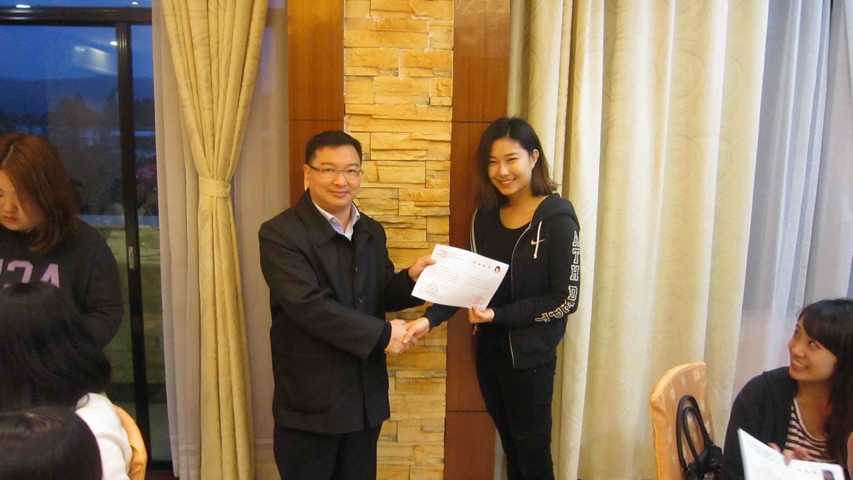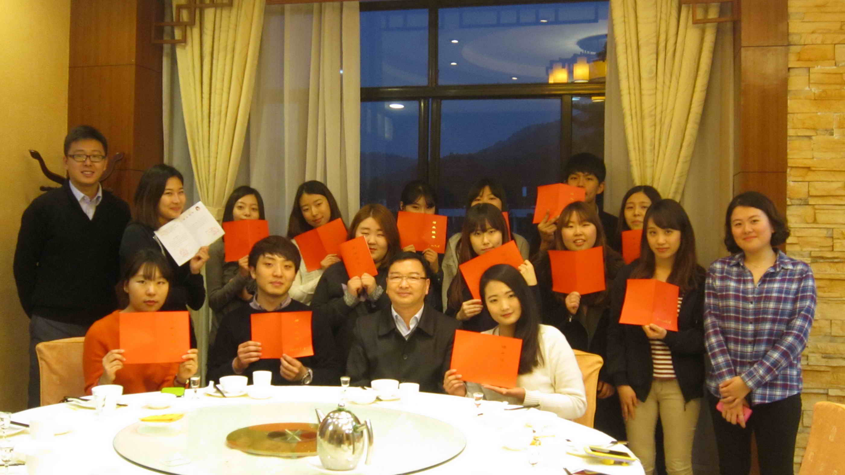 本网讯 2014年1月25日晚,韩国湖西大学冬令营结业典礼在我校清雅园举行。留学生教育学院院长梁学宏、学生工作主管王一仟以及14名冬令营学员出席了此次结业典礼。典礼上,梁学宏为14名冬令营学员一一颁发结业证书,为此次为期三周的冬令营划上了完美的句号。
