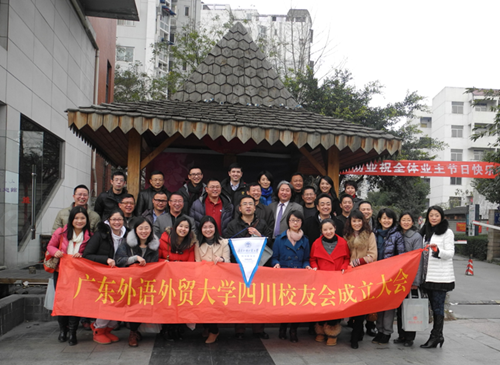本网讯 2014年1月11日,阴雨多日的成都迎来了久违的阳光,广外四川校友会在成都市成立了。近30名在成都工作的校友欢聚一堂。副校长许国彬,校友总会、董事会、教育发展基金会秘书处(以下简称三会秘书处)秘书长谢伟光、副秘书长潘相宇出席了活动。