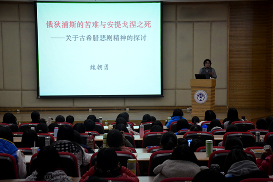 本网讯 12月24日晚,人文大讲堂2013年第六讲迎来中山大学教授、文学哲学双博士魏朝勇。魏朝勇根据多年古希腊罗马文学、政治哲学研究经验,以索福克勒斯的两大悲剧《俄狄浦斯王》与《安提戈涅》为例探讨古希腊悲剧精神。