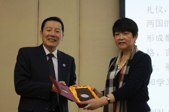 出席讲座现场的有我校副校长方凡泉、东语学院院长陈多友和人事处副处长李悦明等。讲座伊始方凡泉代表学校向陈端端赠送了纪念品。